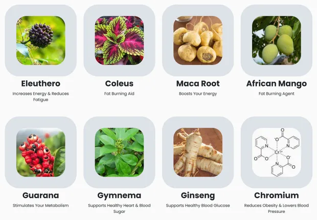- Primary Ingredients: Eleuthero, Coleus, Maca root, African Mango, Guarana, Gymnema, Ginseng, Chromium